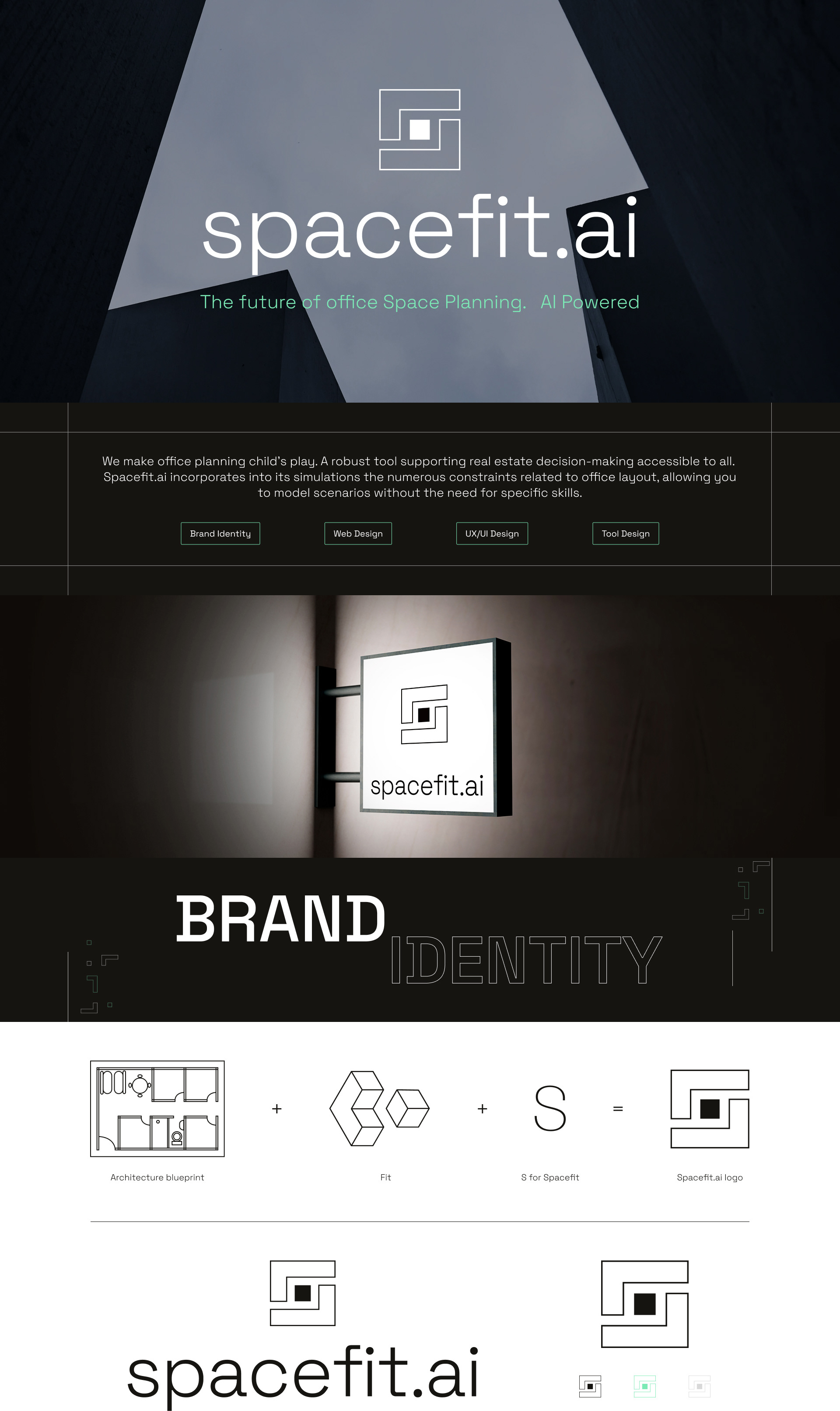 Conception et création identitaire, produit Saas et site de la marque Spacefit.ai, une start-up française spécialisée dans l'aménagement d'espaces de bureau à l'aide de l'IA. / Brand design, product design (Saas) and webdesign for Spacefit.ai, a french start-up specialised in office space planning using AI.